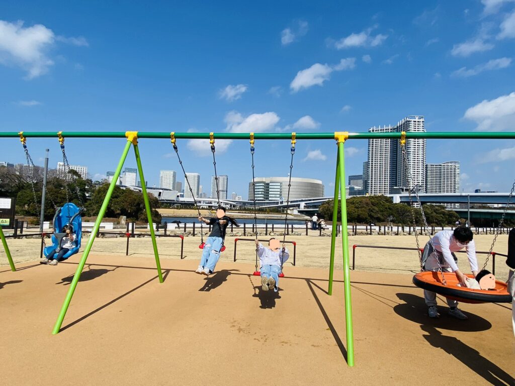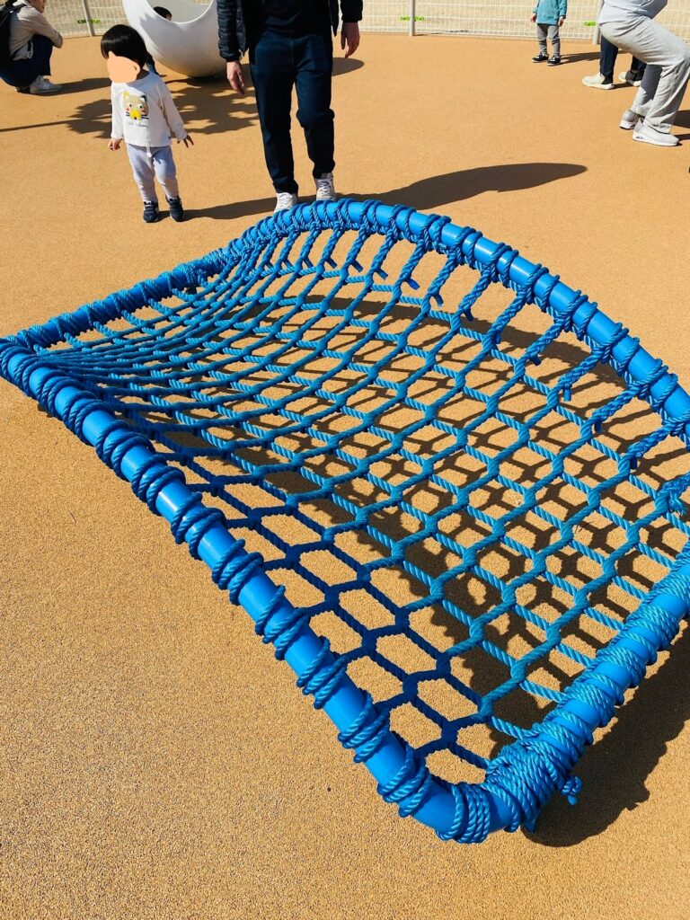 また、複合遊具以外では「複数人で乗れるブランコ」が大人気!10分ほど待ちましたが、寝そべって揺られる不思議な感覚に娘も大はしゃぎでした。