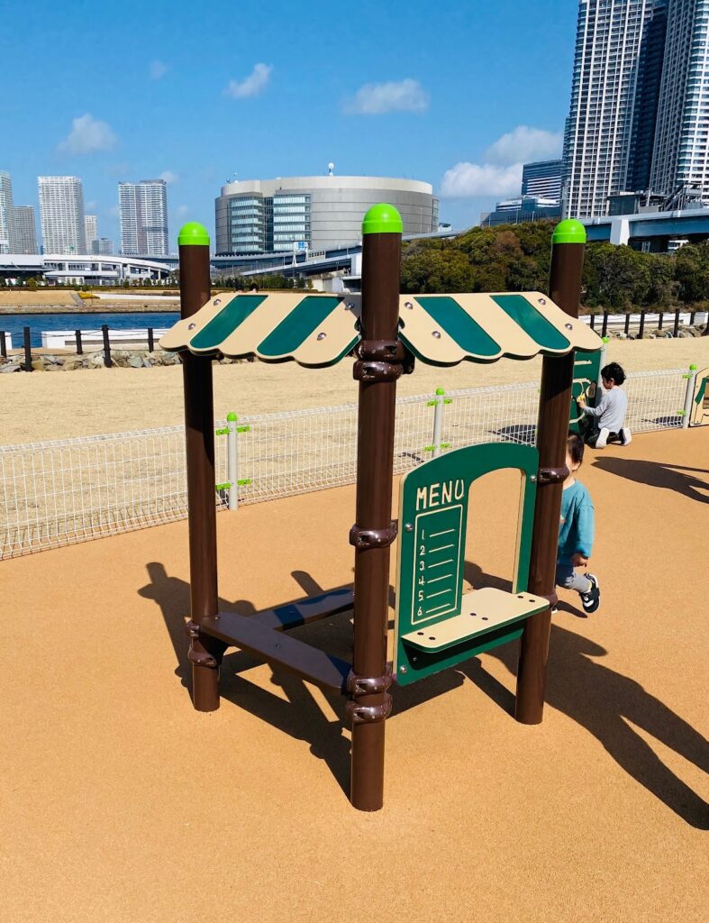 低い位置のネット遊具や、柔らかい素材の飛び石、さらには「お店屋さんごっこ」ができる遊具まで。ここなら、小さなお子さんも自分のペースでゆったり遊べます。