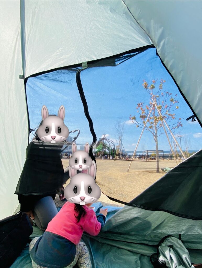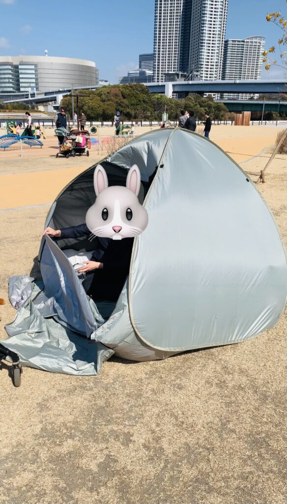 ⚠️ 注意点: 地面に杭(ペグ)は打てません。この日は風が強く、大人一人が中に入っていても飛ばされそうな勢いでした。風が穏やかな日を狙って利用するのがベストです!