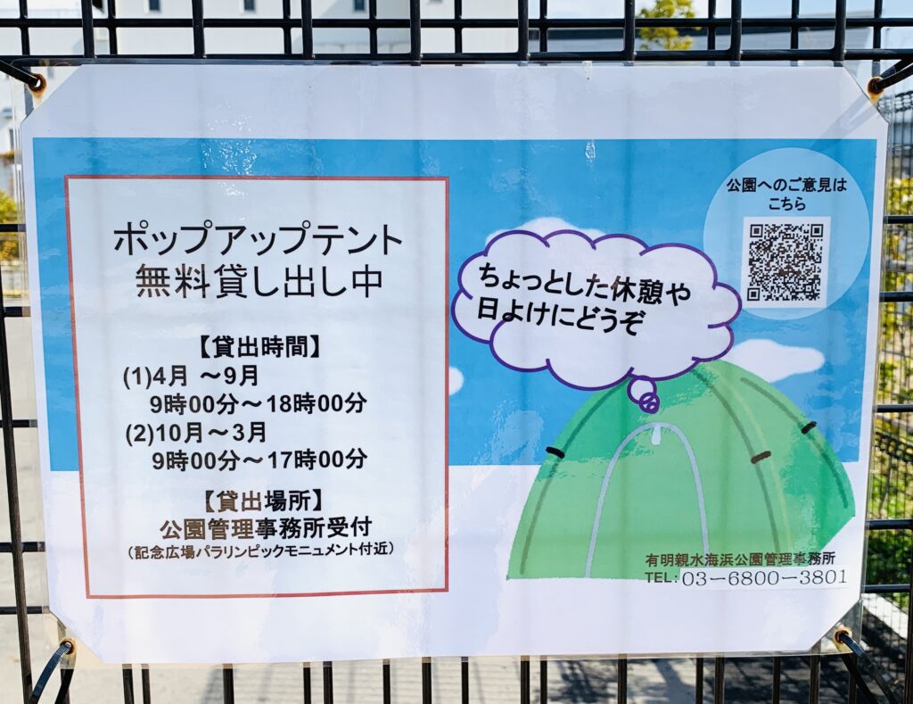 隣接する公園事務所で、なんとテントの無料貸出を行っています。