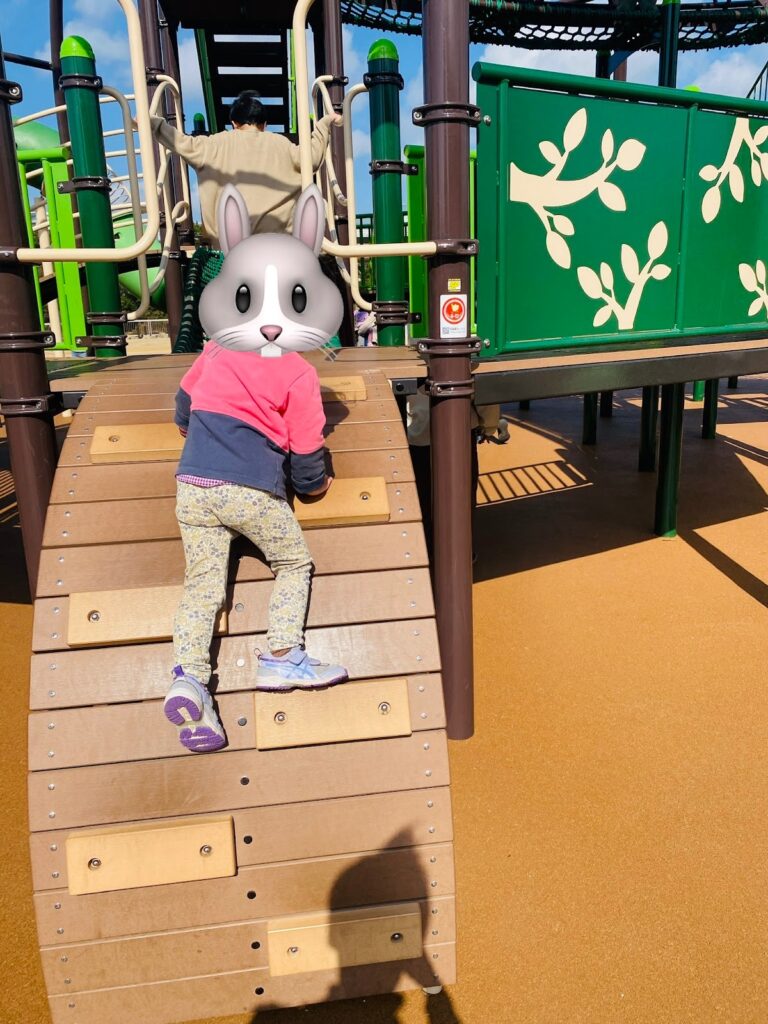 ぶら下がったり登ったりするセクションは、少し大きい子向け。3歳の娘にはまだ難しかったようです。