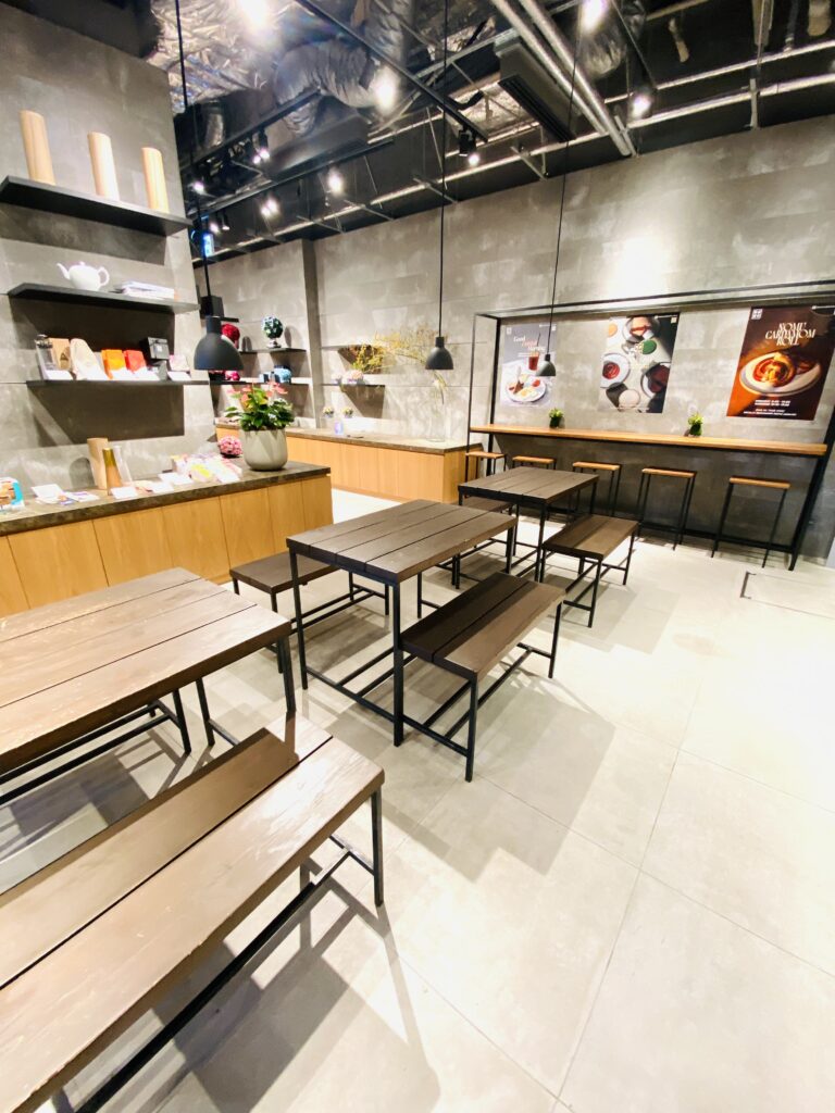 中央広場と一体化しているJPタワーの入り口付近には屋根付きの広場があり、椅子と机がたくさん用意されており、テイクアウトした商品や持参した物を食べることができます。