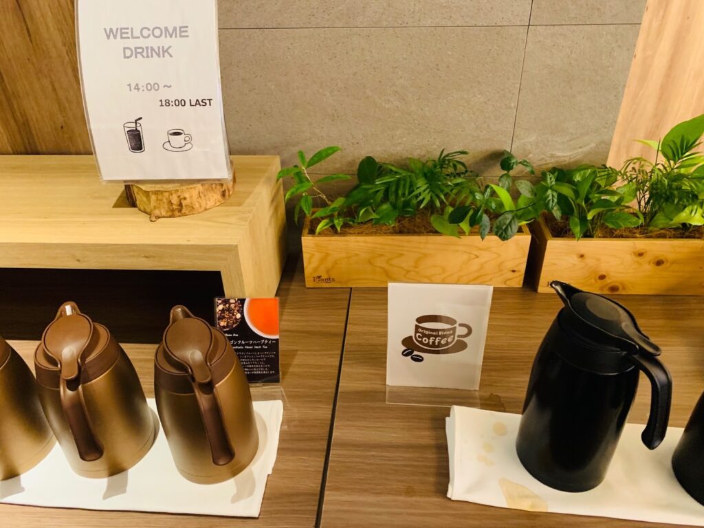 長いドライブを経てホテルに到着。清潔感あふれるロビーにはコーヒーとハーブティーのウェルカムドリンクが用意されていました。