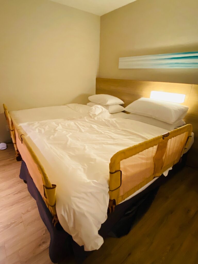 今回はクイーンベッド2台のツインルーム。ベッドガードの設置を予めお願いしていました。