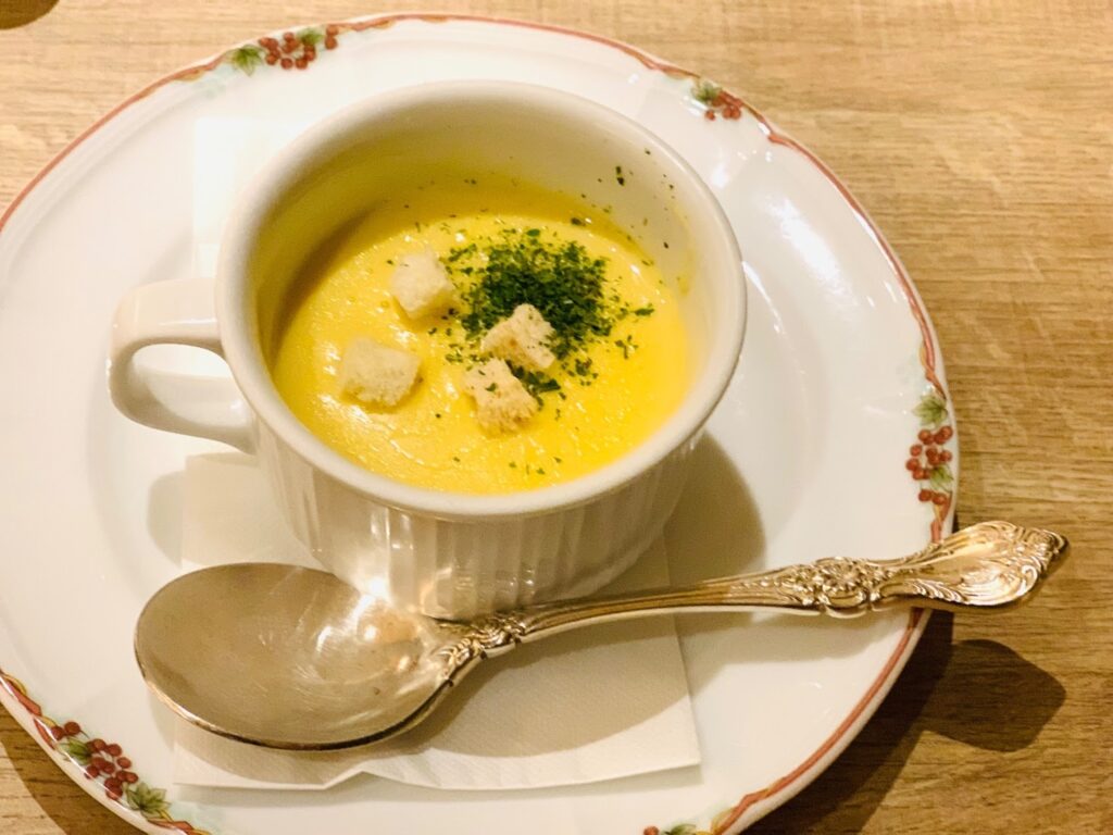 娘の要望でキッズメニューからコーンポタージュスープ(550円)を注文しましたが、本格的な味に娘は夢中!