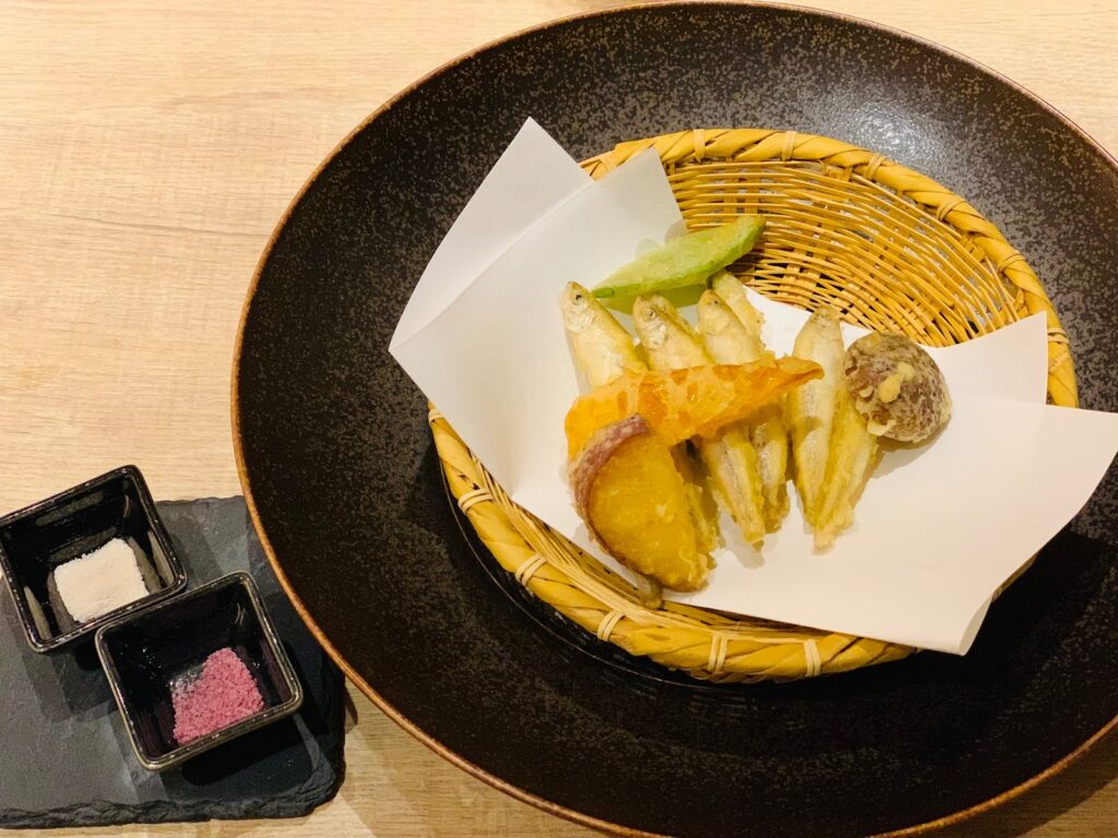 季節のメニューから選んだ、山中湖名物のワカサギと野菜の天ぷらはサクサクで絶品!2種類の塩も美味しかったです!