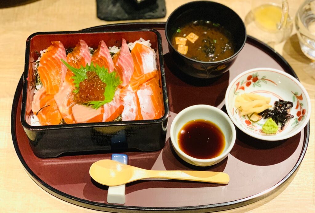 メインは紅富士サーモンといくらの親子重(3,150円)を注文。こちらも季節のメニューで、新鮮なサーモンがたっぷりのっていて大満足。いくらとの相性も抜群で、お味噌汁もホッとする味でした。