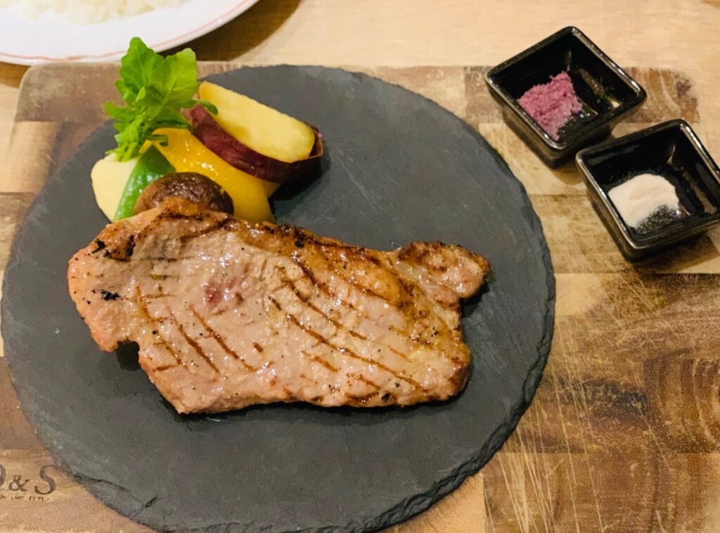 もう一つのメインはお肉料理から甲州富士桜ポーク・ロースのグリル(4,000円)を注文。炭火のような香ばしい焼き目が美味しかったですが、ボリュームはそれほどは無く、少し固めなのも残念でした。