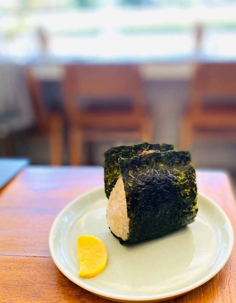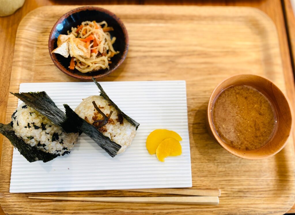 おにぎりは握りたてでふわふわ、お米の甘みと海苔の香りが絶品です。お出汁の効いたお味噌汁と優しい味の小鉢もついて、目覚めの朝にピッタリの完成度の高さでした。