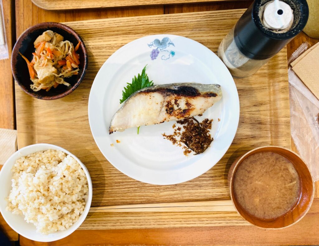お母さんは「焼き魚御膳」を。この日はサワラの西京焼きでした。 身がしっとりふわふわで、朝の胃袋に優しい味わい。特に自家製の「米ヌカふりかけ」が絶品で、これだけでご飯が何杯でもいけちゃいそう!と絶賛していました。お味噌汁との相性ももちろん抜群で、毎朝食べたいほど体に優しいと感じる朝ごはんでした。