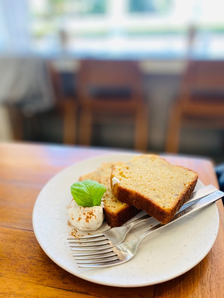 美味しい朝食でお腹が動き出したのか、甘いものも欲しくなり…「自家製バナナケーキ(550円)」を追加注文! しっとりとした生地にバナナの濃厚な香りがギュッと詰まっていて、これは頼んで正解でした。