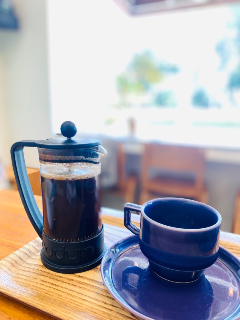 お供のコーヒー(600円)はフレンチプレス式。 たっぷりカップ2杯分楽しめるのが嬉しい!酸味が少なく、ブラックでもスルスル飲めるマイルドな味わい。バナナケーキとの相性も抜群でした。