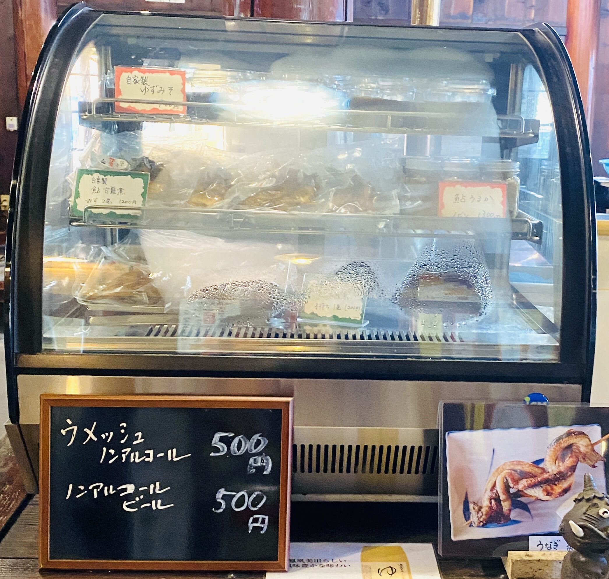 レジ横には、自家製ゆずみそや鮎の甘露煮など、テイクアウトできる商品も並んでおり、思わず手に取りたくなります。