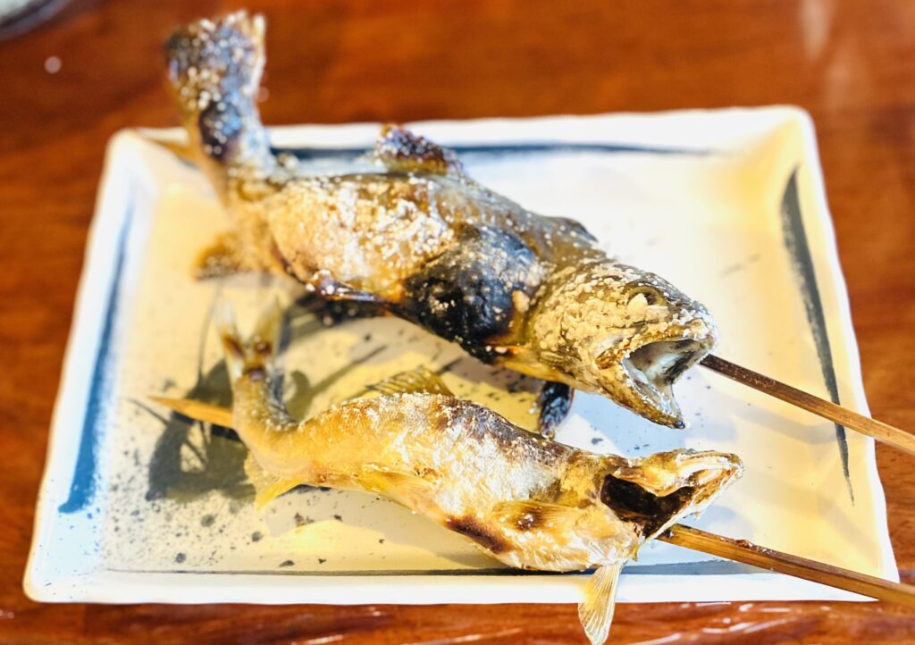 いわなとあゆの塩焼きは、川魚特有のクセはまったく感じず、香ばしい炭火の風味で絶品!表面がサクサクで、尻尾から頭まで丸ごと食べられました。