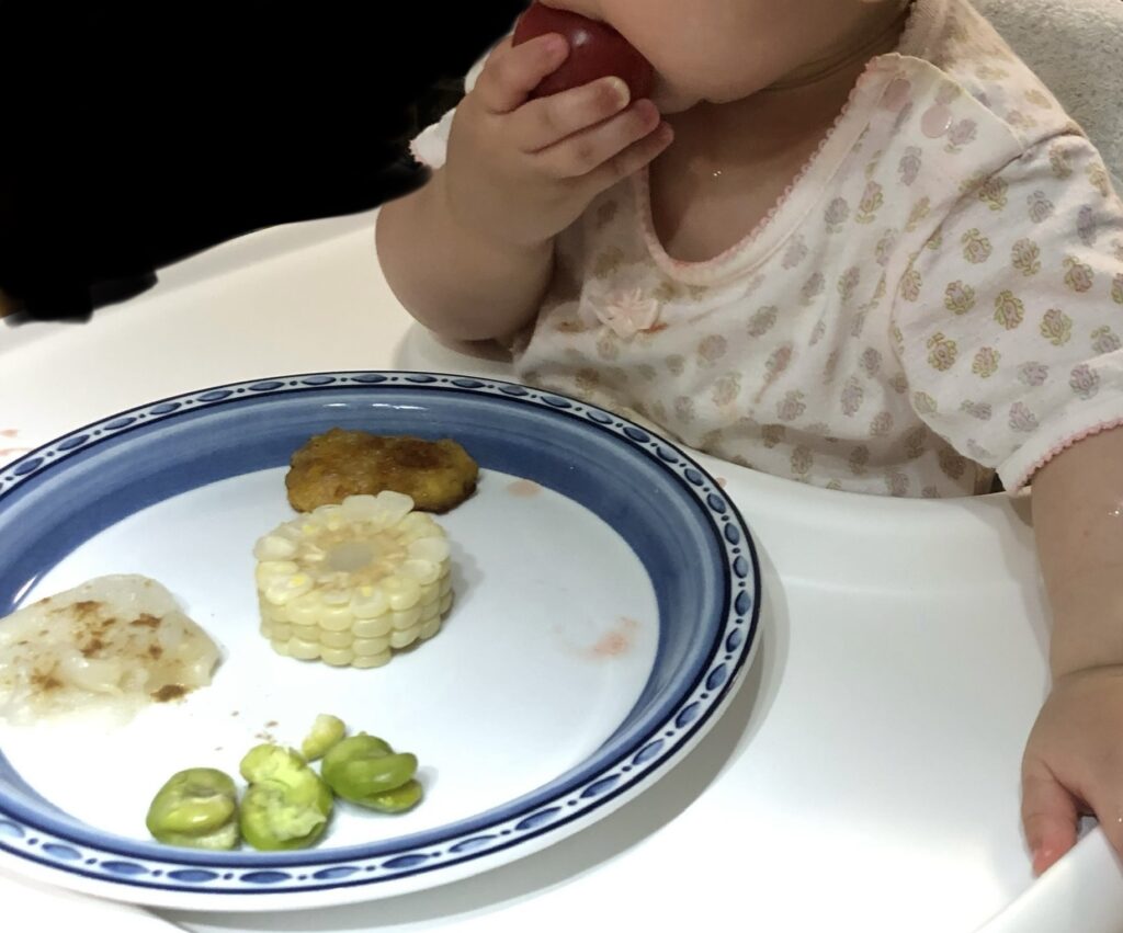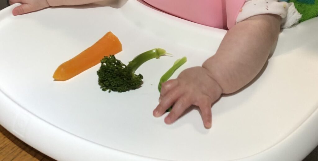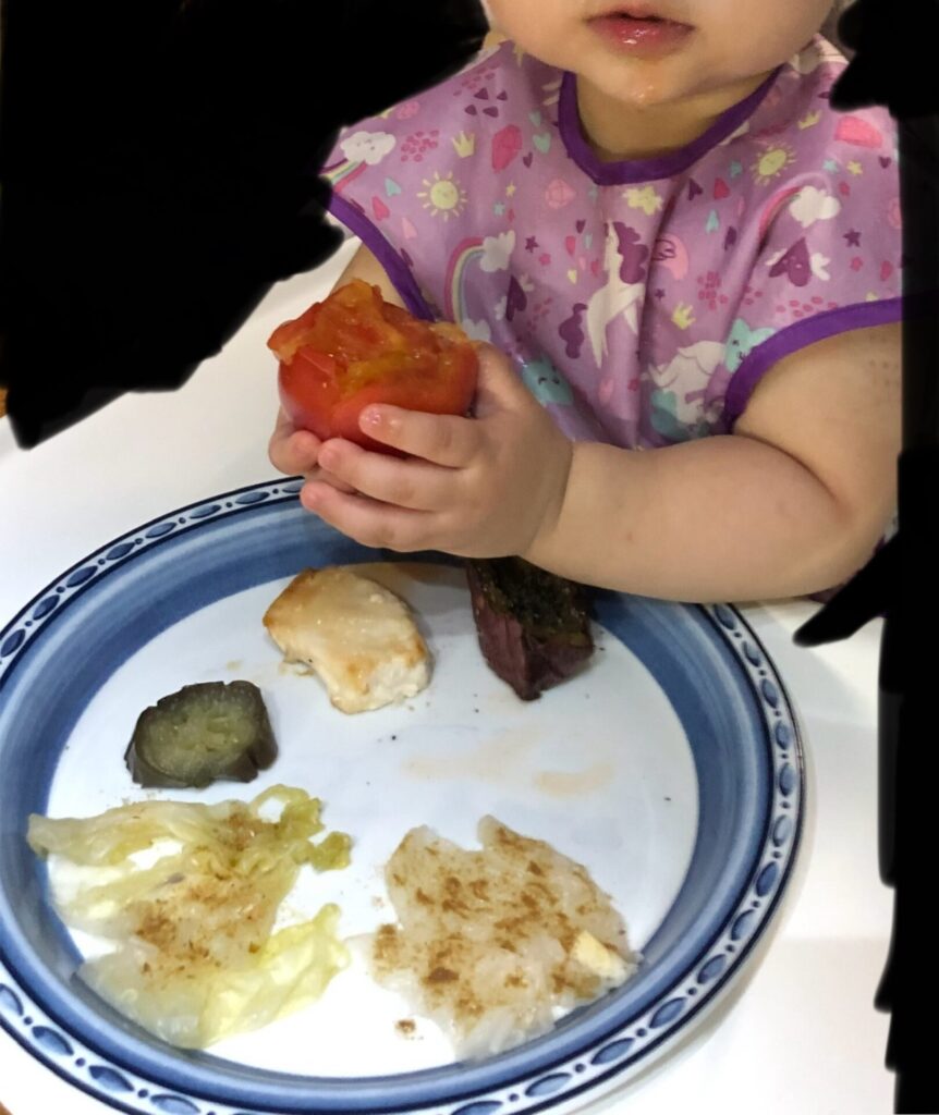 BLW離乳食の様子。自分自身で手掴みで食べる種類や量を選びます。