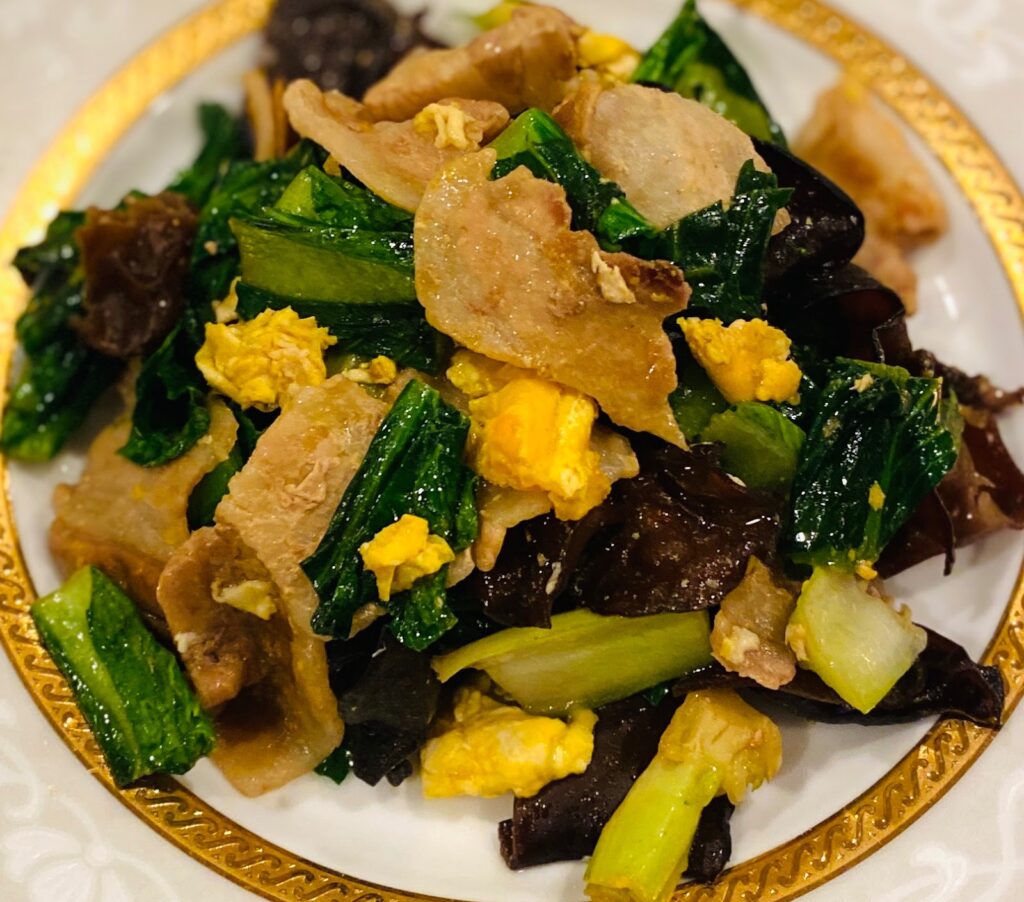 次に、もち豚と小松菜を使った「中華風炒め」。