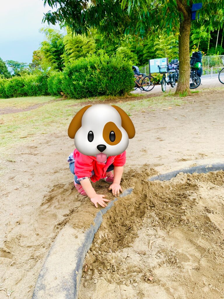 娘も真似して土の掘り進めていきますが、3歳児の力だと少し苦戦していました。