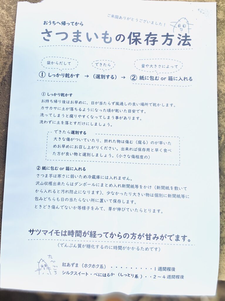 収穫したさつまいもはすぐに食べてもあまり甘くなく、数週間熟成させたほうが甘くなるようです。保存方法の案内用紙ももらいました。