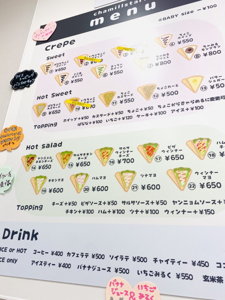 Chamillstarrr(ちゃみるすたー)のクレープは主に、スイーツ系と食事系の2つに分けられます。