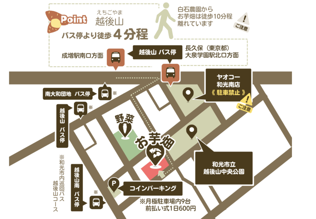 白石農園は東京都板橋区成増にあり、今回のお芋畑は埼玉県和光市南1-18-33の隣でした。路線バスを使う場合は駅前のバス停から「赤塚新町行き」などを利用し、農園最寄りで下車すると徒歩数分です。