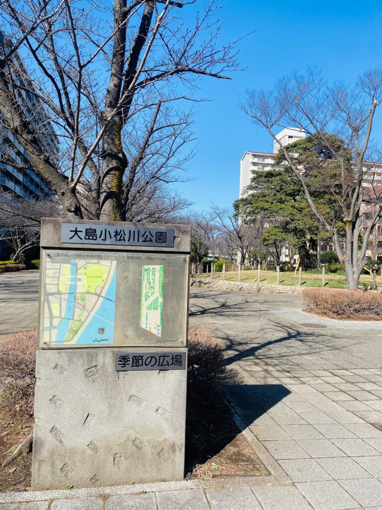 大島小松川公園へは、都営新宿線「東大島駅」の大島口から徒歩1分。駅を出てすぐ公園の入り口が見えるので、ベビーカー移動のパパ・ママも安心のアクセスです。