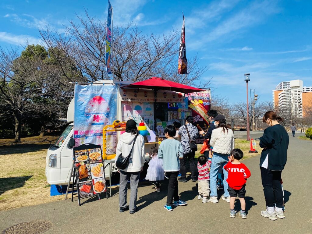 遊びに来た週末はキッチンカーも2台ほど出店していて、唐揚げ・ポテト・フライドチキン・フランクフルト・かき氷などの軽食を楽しんでいる人もたくさんいました。