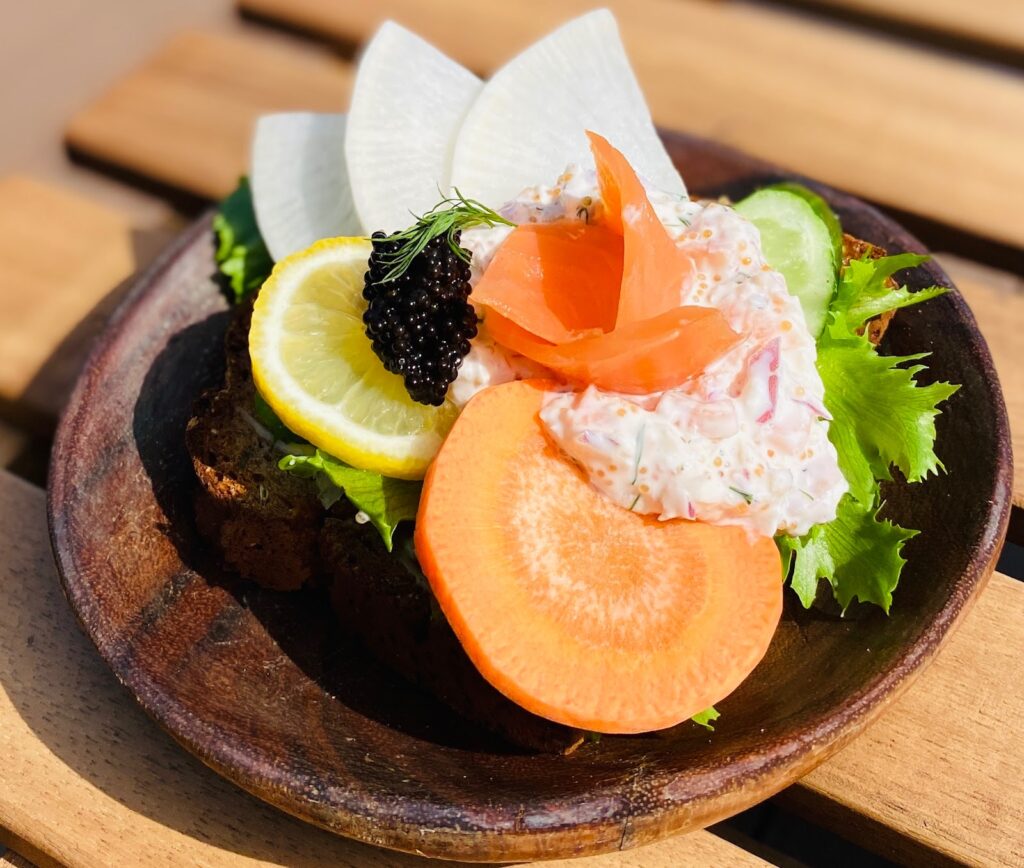 クリームチーズ・レッドオニオン・スモークサーモン・ディル・キャビア・レモンが入ったオープンサンド。黒パンに、とびこのプチプチ感が入ったクリームソースと具材が最高にマッチ!