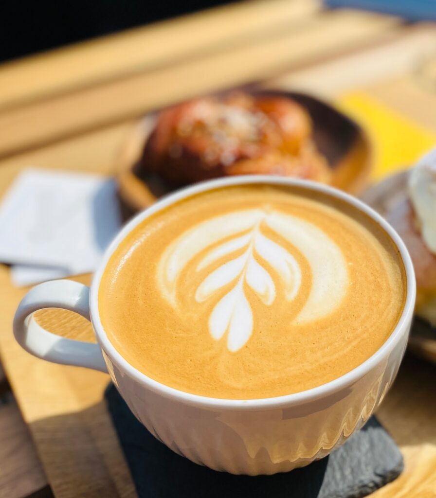 おしゃれなラテアートを施されたカフェラテ。ラージサイズ(760円)だとかなり大きなボウルのようなカップで提供され、ボリュームタップリ!2人でシェアしてちょうど良い量でした。