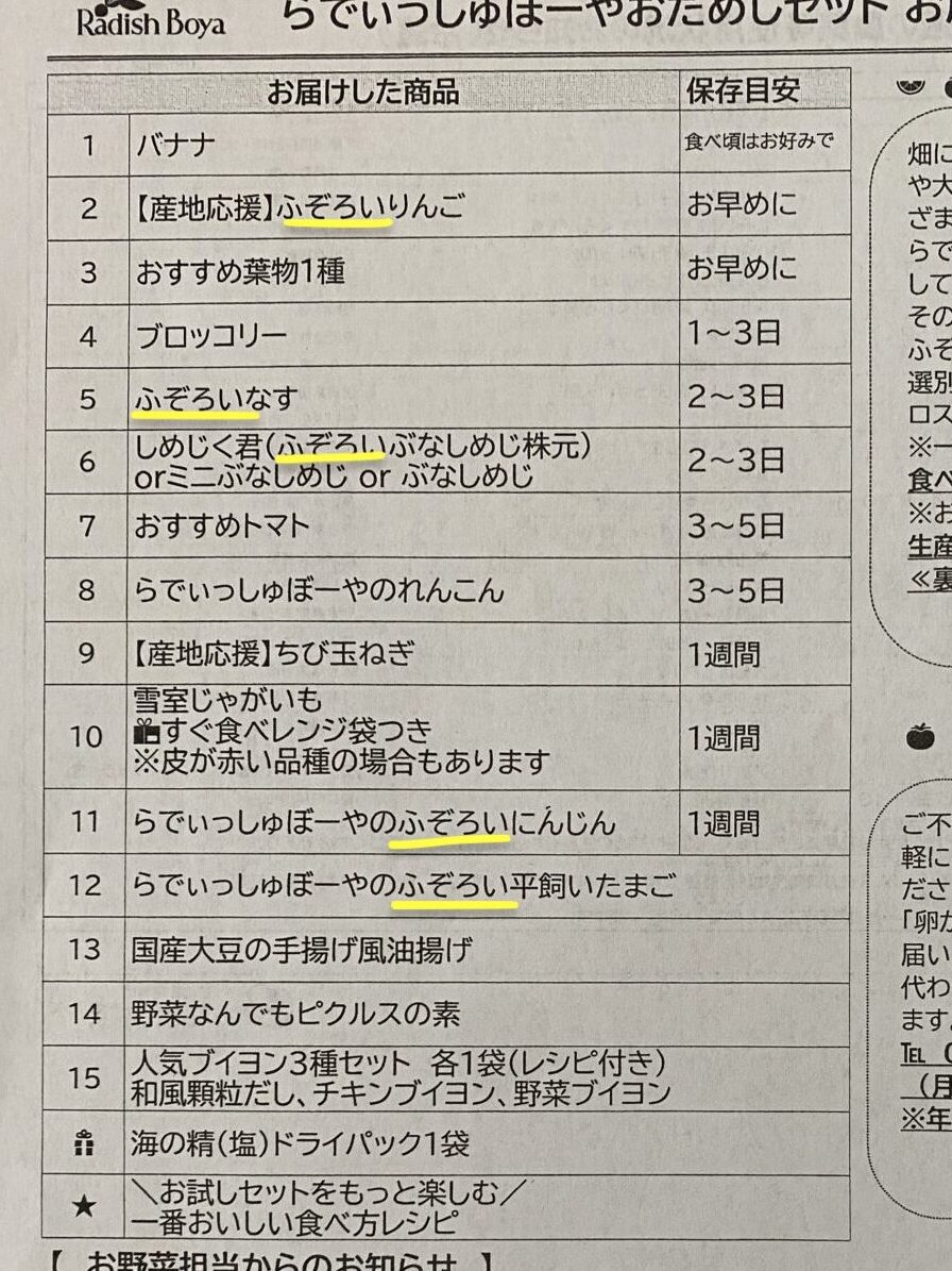 お試しセットの中には、「ふぞろい」という表記の野菜がいくつか入っていました。これは、見た目は少し不揃いだけど、味や安全性は正規の商品と同じという商品です。