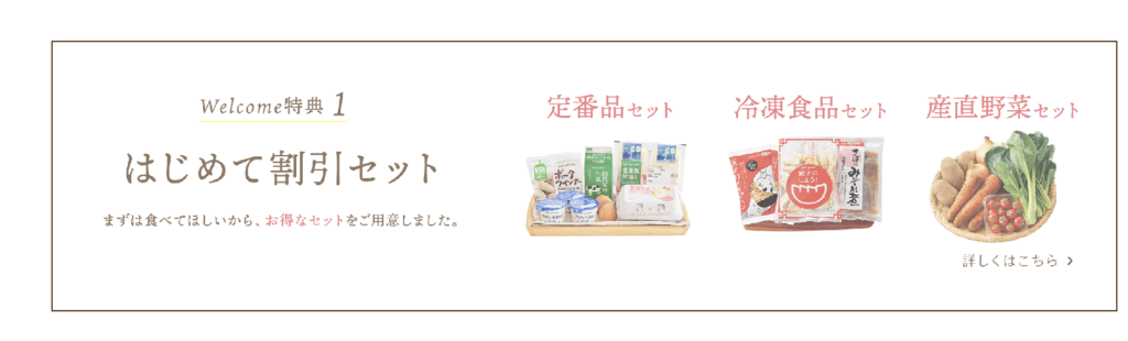 本入会の特典として、1回限り「初めて割引セット・産直野菜」が586円(税込)でお試しできます。トマト、小松菜、玉ねぎ、ジャガイモ、人参といった王道の野菜をとってもお得な値段で試せるので、本入会した方は是非注文してみてください。