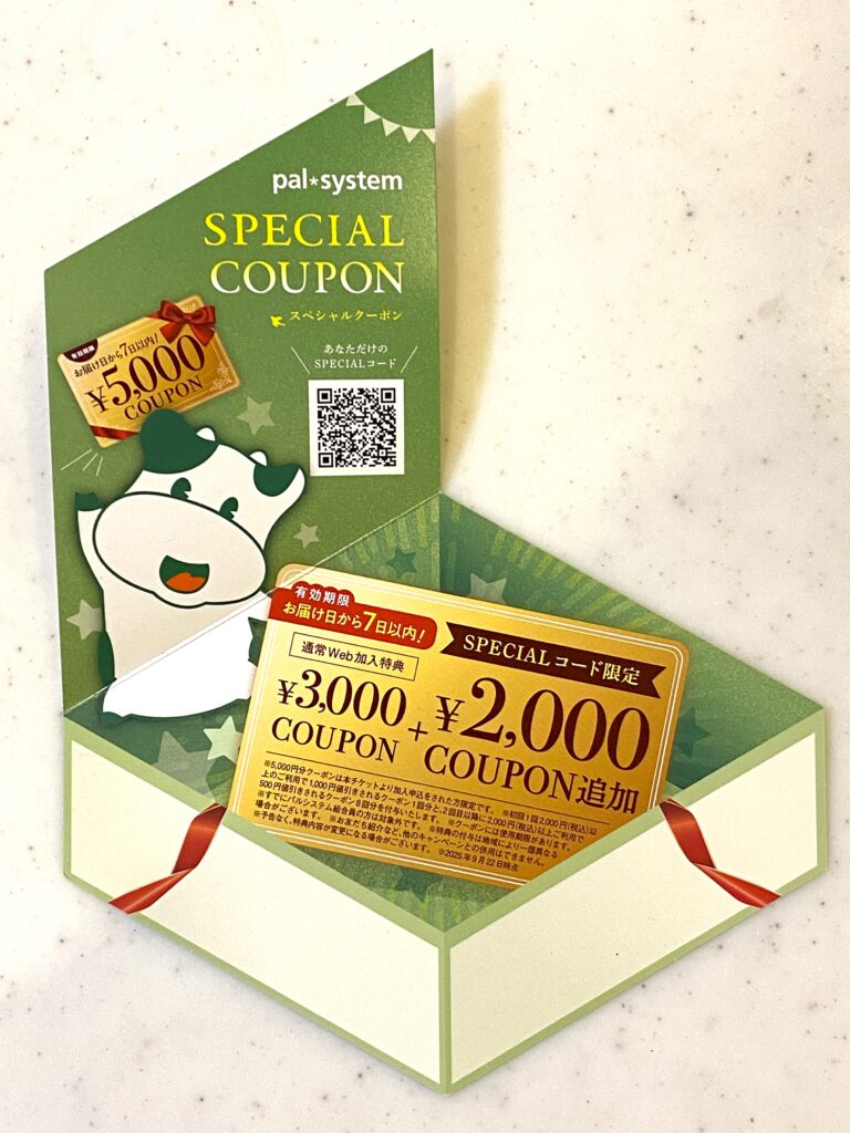 スペシャル特典は、通常の加入特典は3,000円分クーポンですが、お試しセット到着後7日以内に加入すると5,000円分になるというものでした。