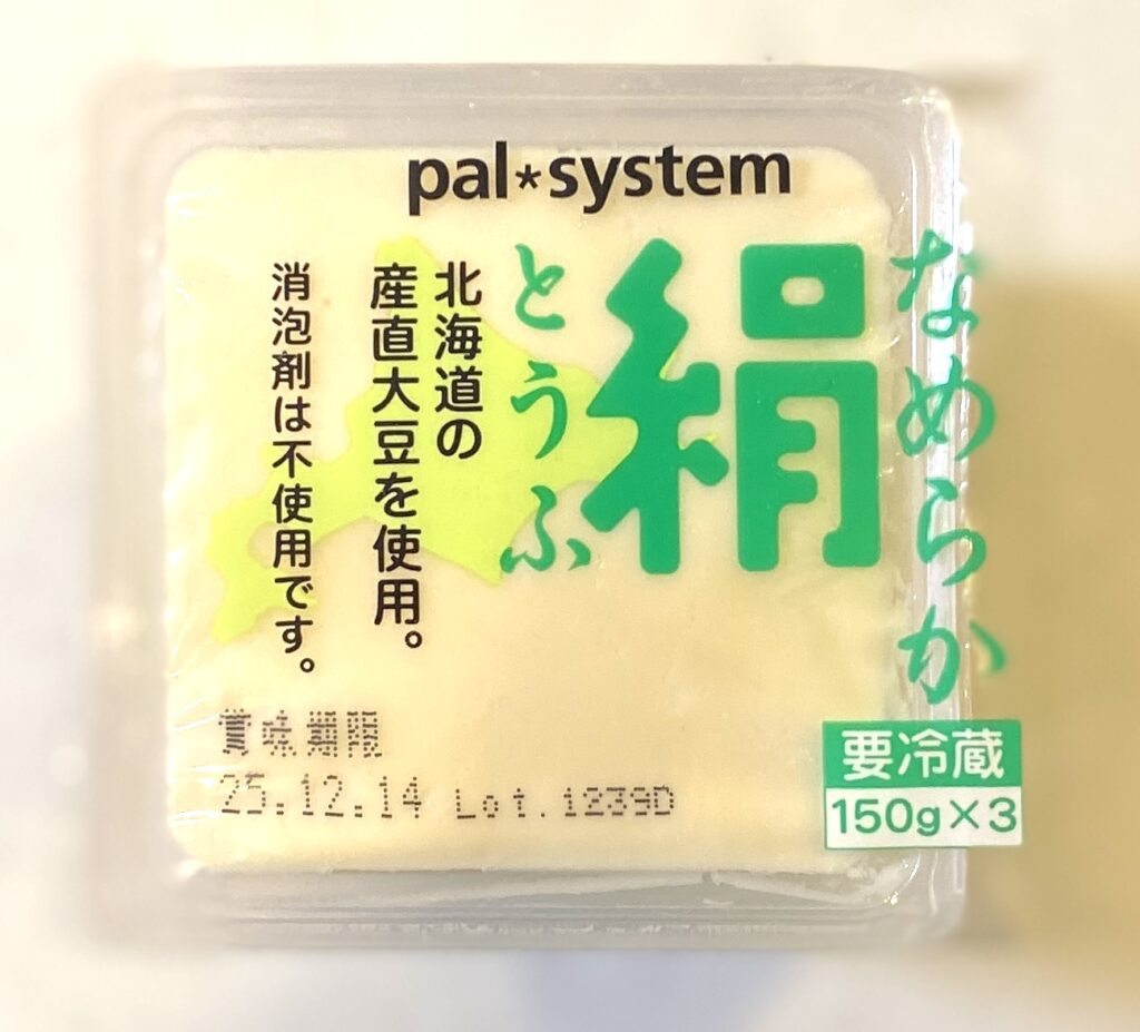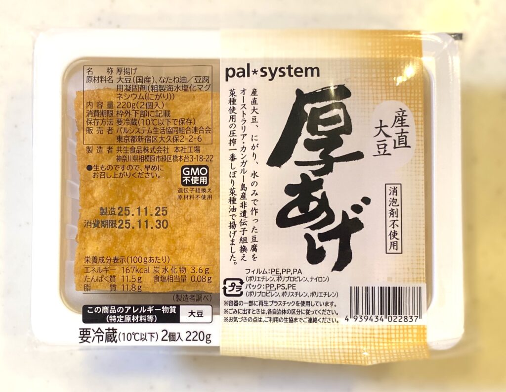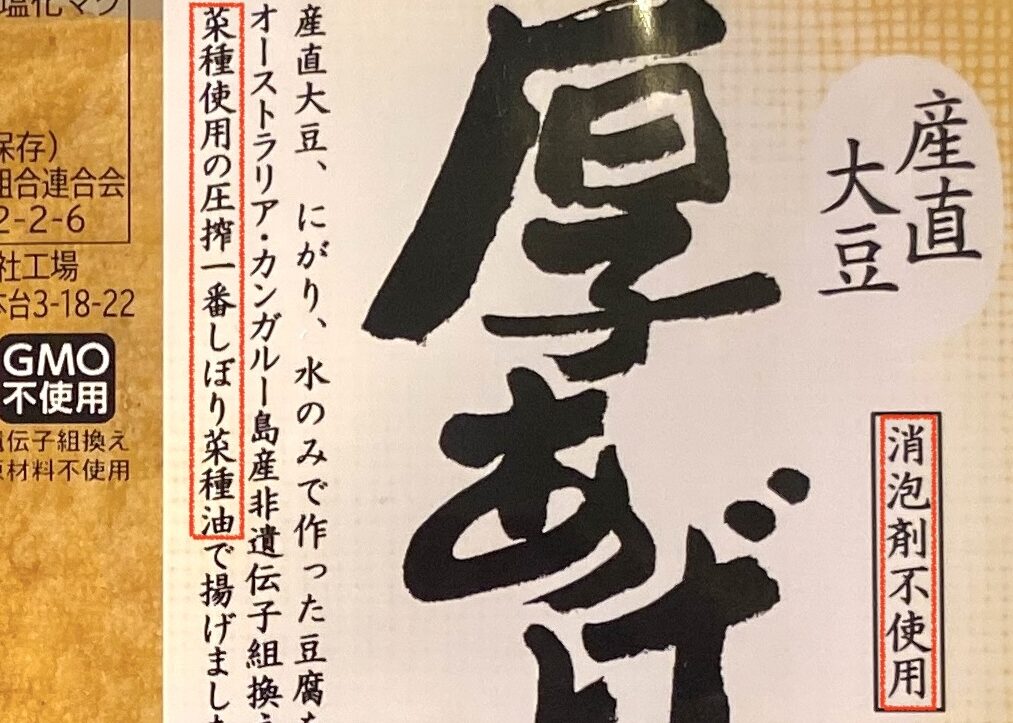 非遺伝子組み換え大豆・ニガリ・水のみで作られた豆腐(消泡剤不使用)、使用している油は圧搾一番搾り菜種油と原材料にこだわっている様子が伝わる一品。