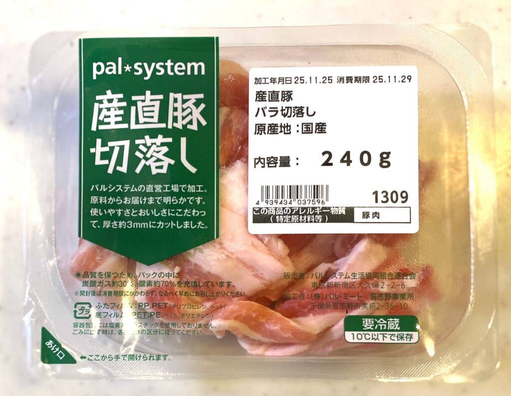 パルシステムの「産直豚バラ切り落とし」は、顔が見える生産者(産直)が大切に育てた豚を使用しており、脂の甘みと旨みをしっかり感じられる人気商品です。