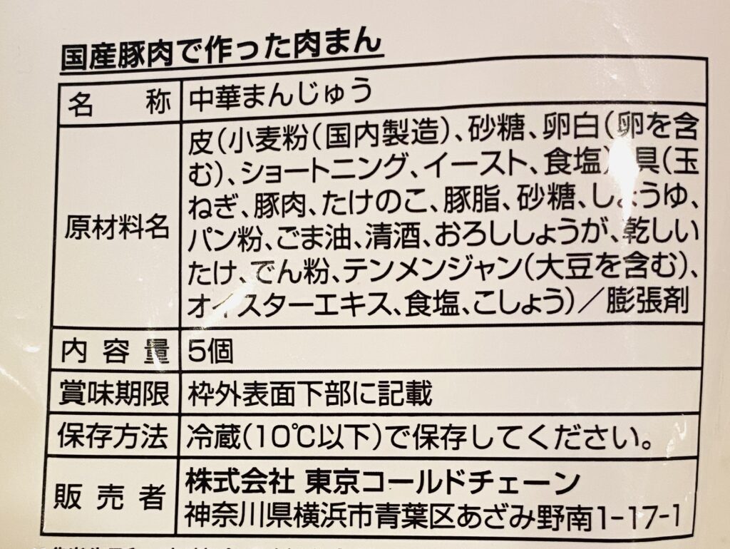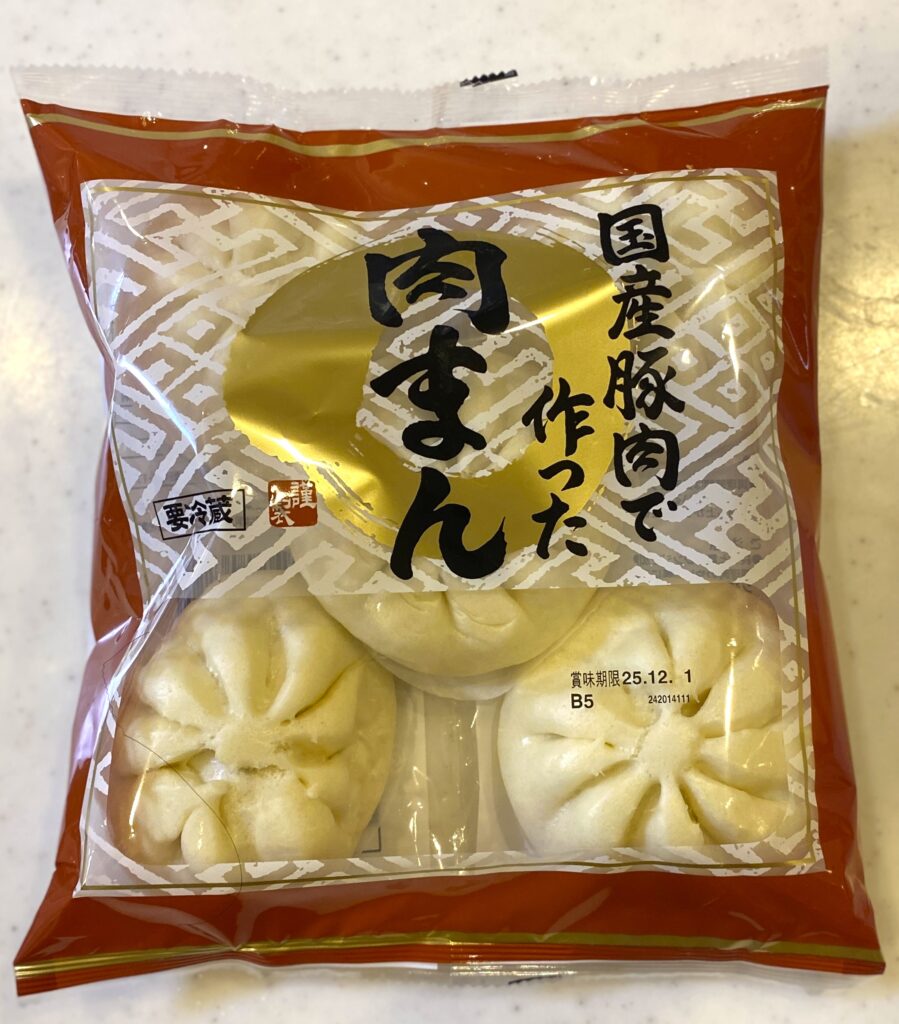 1袋5個入りの肉まん。添加物は膨張剤のみで比較的少ないですが、ショートニングを使用している点など、この商品については原材料が気になる人もいるかもしれません。