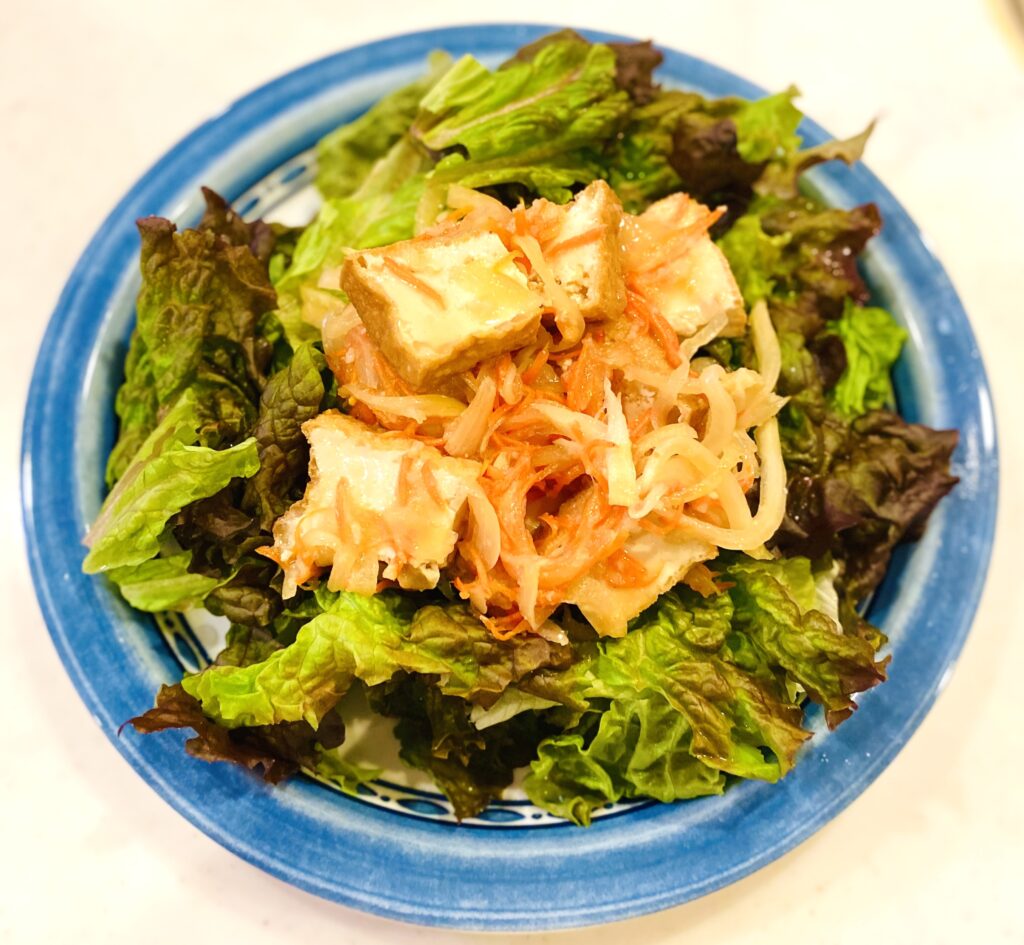 玉ねぎとにんじんを酢とみりんで和え、南蛮漬けにしていただきました。濃い豆腐の味と油の良い風味を感じることができ、美味しくいただきました。豆腐はずっしりとしていて密度が高く、食べ応えもありました。
