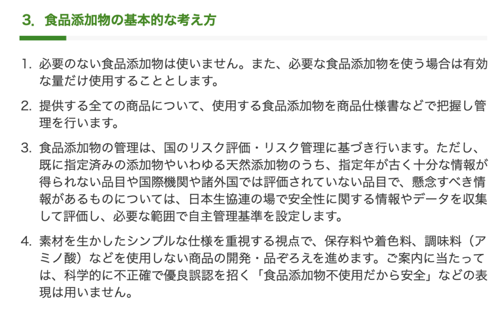 不使用・制限の徹底: 国が認めている添加物でも、生協独自の判断で使用を控えている