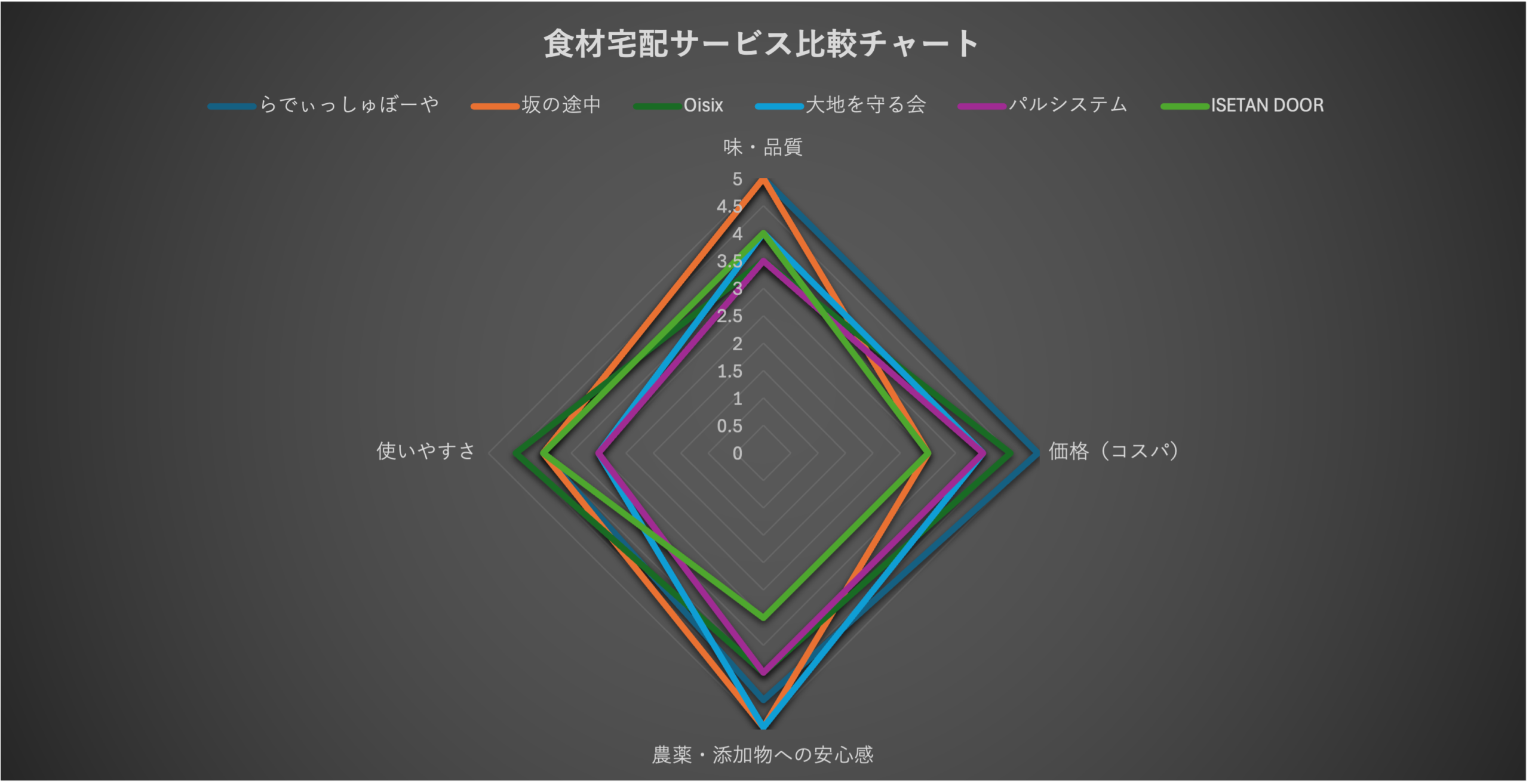 | 1位:らでぃっしゅぼーや(4.625点) | ★★★★★ | ★★★★★ | ★★★★☆(4.5) | ★★★★☆ |