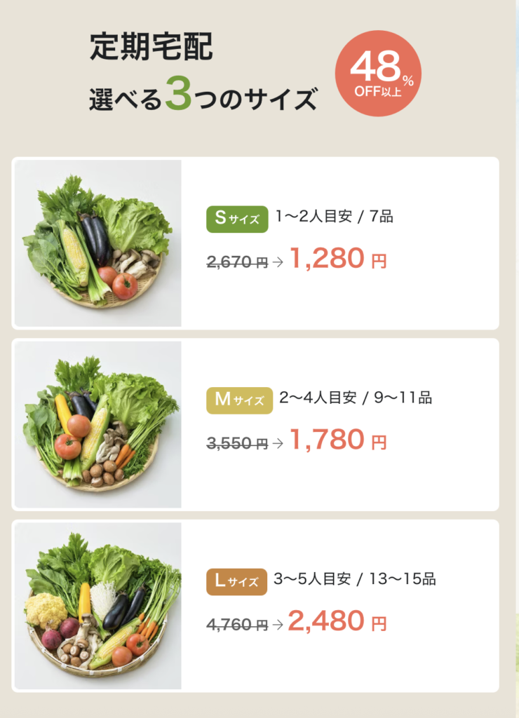 野菜の味・品質、価格(コスパ)、安全性、利便性全てにおいて高評価とバランスが良く、誰にでもおすすめできます。強いてデメリットを上げるなら、ミールキットは体験できないくらいでしょう。