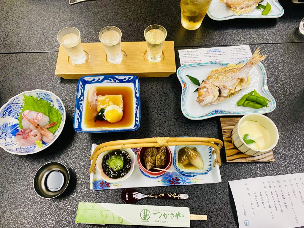 今回の夕食は基本プラン”新鮮野菜と庄内の海の幸を堪能(2食付)39,050円についていた内容でした。つかさや旅館では日本酒にも力を入れており、地元山形の日本酒を提供してもらえます。今回は、おすすめの『日本酒3種飲み比べ』1,320円を追加でお願いしました。